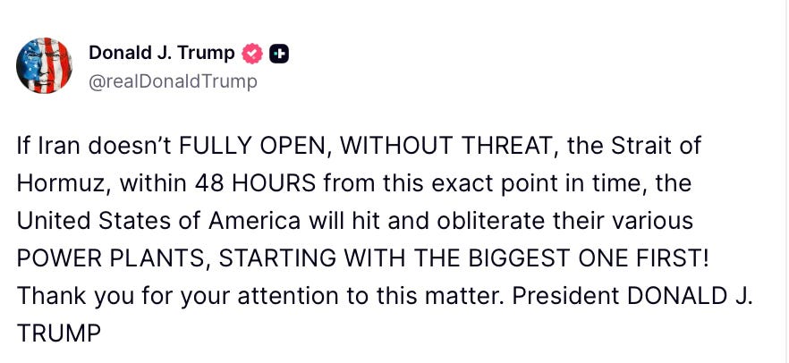 On the evening of March 21, U.S. President Donald Trump issued an ultimatum to Iran: he would bomb its power plants if Tehran didn’t fully reopen the Strait of Hormuz. He wrote on social media, “If Iran doesn’t FULLY OPEN, WITHOUT THREAT, the Strait of Hormuz, within 48 HOURS from this exact point in time, the United States of America will hit and obliterate their various POWER PLANTS, STARTING WITH THE BIGGEST ONE FIRST!” Tehran warned that it would respond in kind. Ebrahim Zolfaghari, an Iranian military spokesman, said that if Trump followed through, Tehran would attack U.S. and Israeli energy infrastructure, as well as desalination plants operated by U.S. allies in the Gulf. Tehran also vowed to keep the strait closed until Iranian power plants were rebuilt.